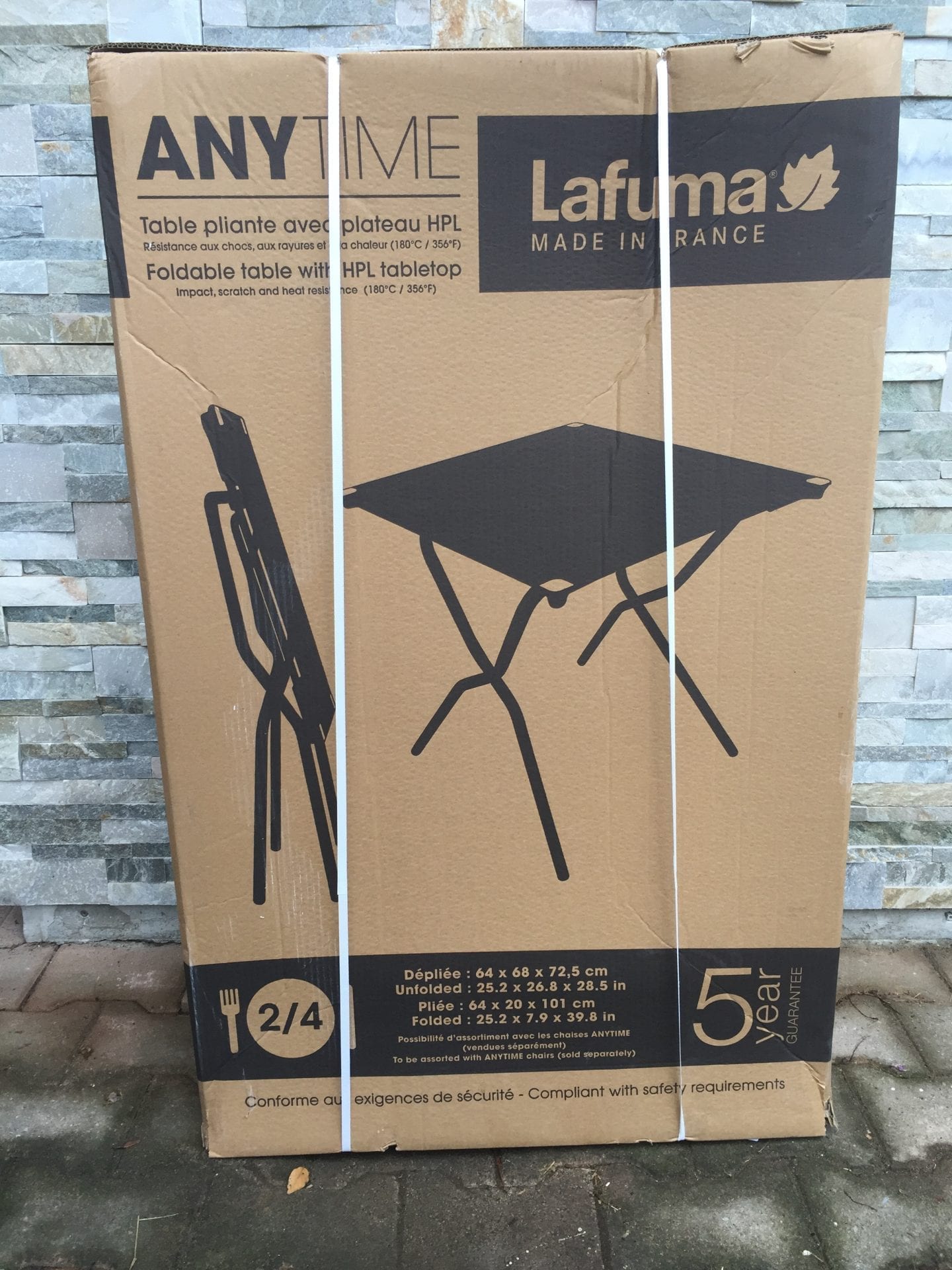J’ai choisi un pack regroupant une table carrée (68 x 64 cm) de couleur Taupe et deux chaises de couleur Arctic. J’aime beaucoup le contraste entre ces deux couleurs et le côté pepsy du bleu Arctic. Même si Lafuma fête ses 60 ans, le design et les couleurs sont fun et colorés… 😉